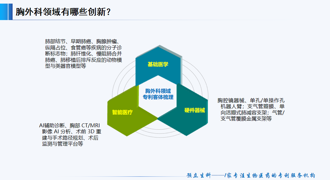 胸外科领域的创新包括基础研究类(如肺癌、食管癌、纵隔肿瘤等疾病的早期诊断标志物、动物模型及靶向/免疫药物研发等)、智能医疗类(如基于医学影像的术前三维重建、手术路径规划、术中导航与机器人辅助手术、术后智能康复管理、AI辅助诊断等)、硬件器械类(如微创手术器械、智能吻合装置、人工气管、胸腔引流系统等)。