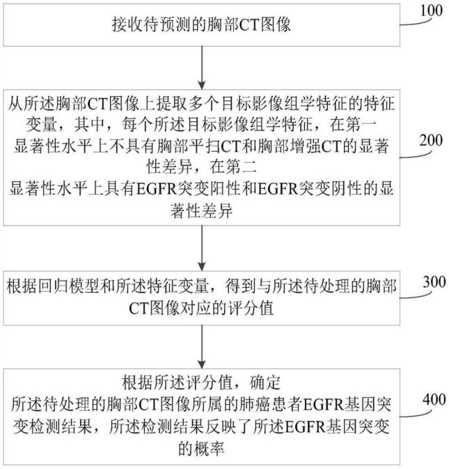 本发明通过提取在不同类型胸部CT图像上均稳定有效且对EGFR基因突变状态具有区分能力的影像组学特征,并结合回归模型计算评分值,实现了对EGFR基因突变概率的准确检测。该方法适用于胸部平扫CT和增强CT图像,临床适用范围广,提高了EGFR基因突变检测的可行性与实用性,便于在临床实践中推广使用。
