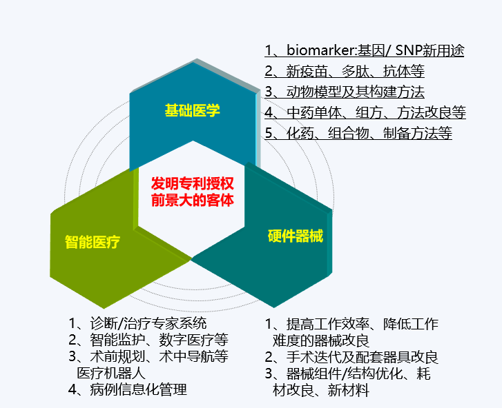 医疗领域可申请专利的客体广泛而多样,主要可分为三大类:基础医学、硬件器械和智能医疗。